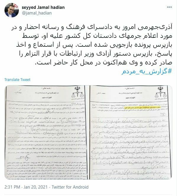 قبل از این محمد جواد آذری جهرمی، وزیر ارتباطات و فناوری اطلاعات با اعلام جرم دادستان کل کشور و شکایت صداوسیما به دادسرای فرهنگ و رسانه احضار شده بود.
