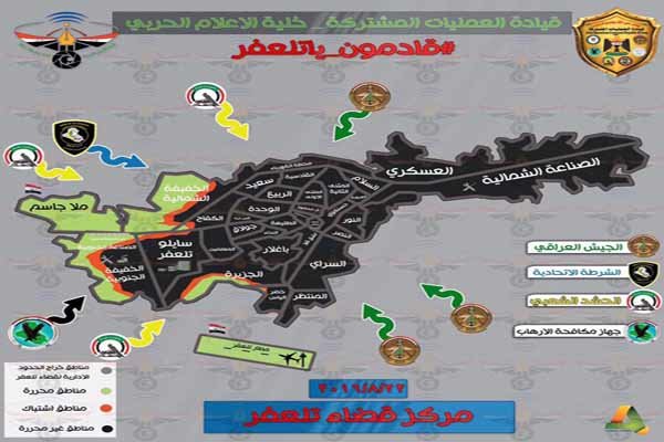 این درحالی است که منابع عراقی نقشه مناطق آزادشده در تلعفر از زمان شروع این عملیات تاکنون را منتشر کردند. در این نقشه مناطق غیرآزاد شده با رنگ مشکی، مناطق آزاد شده با رنگ سبز و مناطق درگیر با رنگ قرمز مشخص شده است.