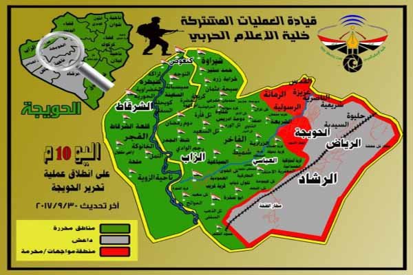 به گزارش خبرگزاری مدار شرقی به نقل از الفرات نیوز، فرماندهی عملیات مشترک عراق نقشه مناطق باقیمانده تحت اشغال داعش را در الحویجه در جنوب غرب کرکوک منتشر کرد.