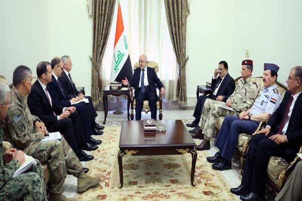 دفتر حیدر العبادی نخست وزیر عراق با صدور بیانیه اعلام کرد: حیدر العبادی نخست وزیر امروز در دفترش با جیمز ماتیس وزیر دفاع آمریکا و هیات همراهش دیدار و گفتگو کرد. در این دیدار تقویت همکاری میان دو کشور در زمینه های نظامی، آموزشی و تسلیحاتی مورد رایزنی قرار گرفت. همچنین در این دیدار جنگ ضد تروریسم و پیروزی های به دست آمده نیروهای عراقی بر داعش مورد بحث و تبادل نظر قرار گرفت.